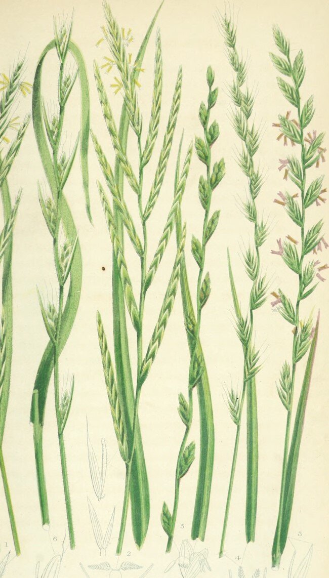 Drawing of the "heads" of various British grasses, Pratt, Anne, 1806-1893 [No restrictions, Wikimedia commons).
