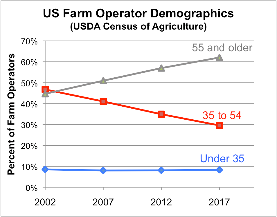 Over the past 15 years, the proportion of young farmers (say under 35), has stayed virtually constant at just under 10 percent. The proportion of “middle aged” farmers has dropped steadily from 47 percent to 30 percent. It is the “55 and over” segment of farm operators that has increased 17 percent, rising from 45 percent in 2002 to 62 percent in 2017.